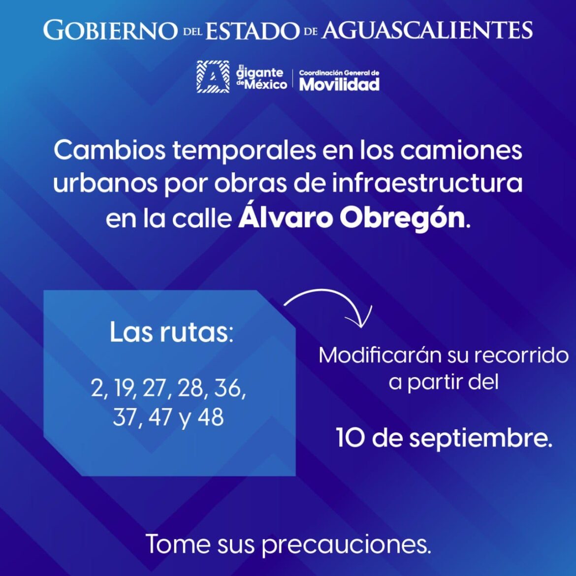 HomeCiudad AGSA partir de este miércoles algunas rutas del transporte público sufrirán modificaciones temporales por el cierre parcial al tránsito vehicular en la calle Álvaro Obregón; las rutas de camiones urbanos que circularán por vialidades alternas son: 2, 19, 27, 28, 36, 37, 47 y 48.