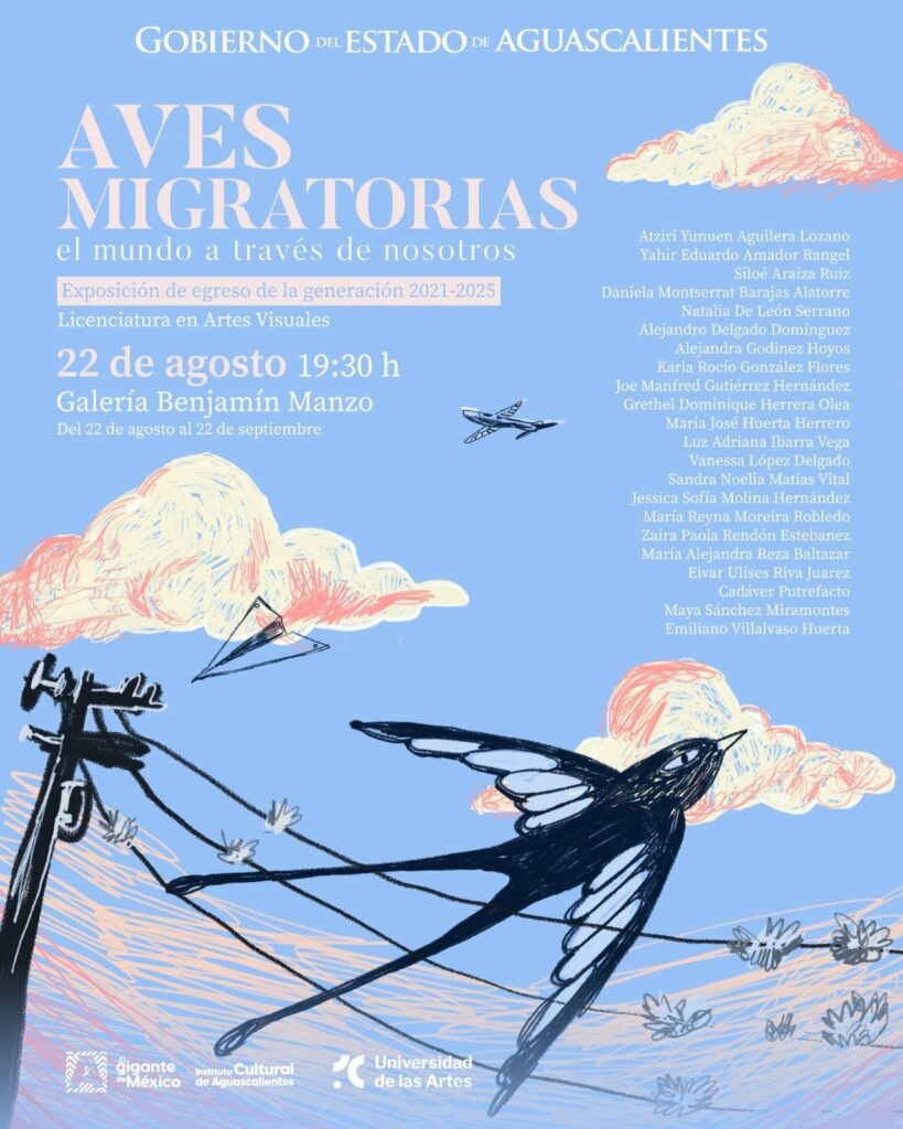 19:30 h Inauguración “Aves Migratorias”, el mundo a través de nosotros, exposición de egreso de generación 2021-2025 de Licenciatura en Artes Visuales de la Universidad de las Artes