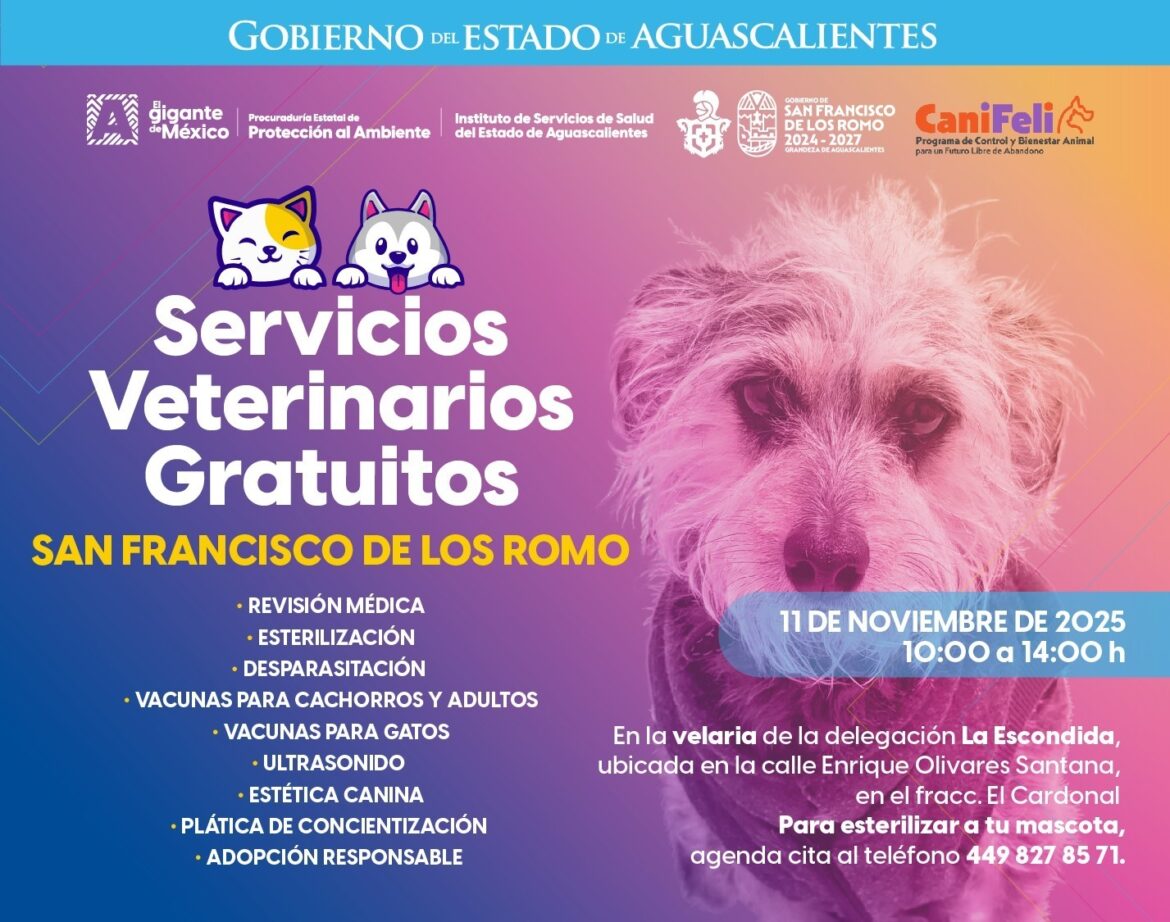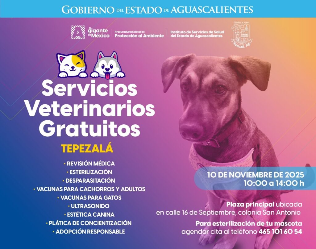 ¿Quieres que tu mascota reciba atención médica gratuita y de calidad? El Gobierno del Estado te invita a las Jornadas de Servicios Veterinarios Gratuitos que se realizarán en los municipios de Tepezalá, San Francisco de los Romo y Cosío para cuidar la salud de tus compañeros de vida.