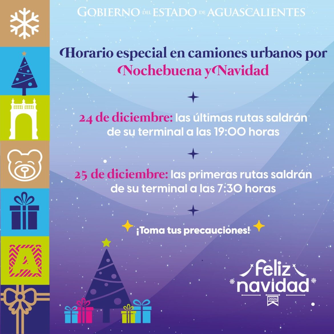 Ciudad AGSMOVILIDADNAVIDAD 2024 El servicio de camiones urbanos tendrá modificaciones en sus horarios los días 24 y 25 de diciembre debido a las festividades navideñas. by admin 21 de diciembre de 2024 written by admin 21 de diciembre de 2024 0 comments Share 0FacebookTwitterPinterestTumblrVKWhatsappThreadsBlueskyEmail 276 El 24 de diciembre las rutas iniciarán en su horario habitual, pero los últimos camiones saldrán de las terminales a las 19:00 horas. El 25 de diciembre el servicio comenzará más tarde, con las primeras salidas programadas a las 7:30 horas. el gigante de México Share 0 FacebookTwitterPinterestTumblrVKWhatsappThreadsBlueskyEmail admin previous post RECONOCE TERE JIMÉNEZ LA IMPORTANTE LABOR DE LOS POLICÍAS PARA MANTENER A AGUASCALIENTES COMO DESTINO IDEAL DE INVERSIÓN next post TERE JIMÉNEZ CONTINÚA IMPULSANDO PROYECTO INTEGRAL DE REÚSO DEL AGUA You may also like Una noche inolvidable en el Foro del Lago, llena de ritmos vibrantes que... 23 de abril de 2026 CON EL CORAZÓN EN EL AULA, LAS EDUCADORAS SIEMBRAN SUEÑOS PARA TODA LA... 23 de abril de 2026 INAUGURA TERE JIMÉNEZ LA EXPO CAMPO Y EL PABELLÓN HECHO EN AGUASCALIENTES EN... 23 de abril de 2026 Martes 21 de abril 23 de abril de 2026 Te compartimos las actividades de la feria nacional de San Marcos para este... 23 de abril de 2026 Lunes 20 de abril 23 de abril de 2026