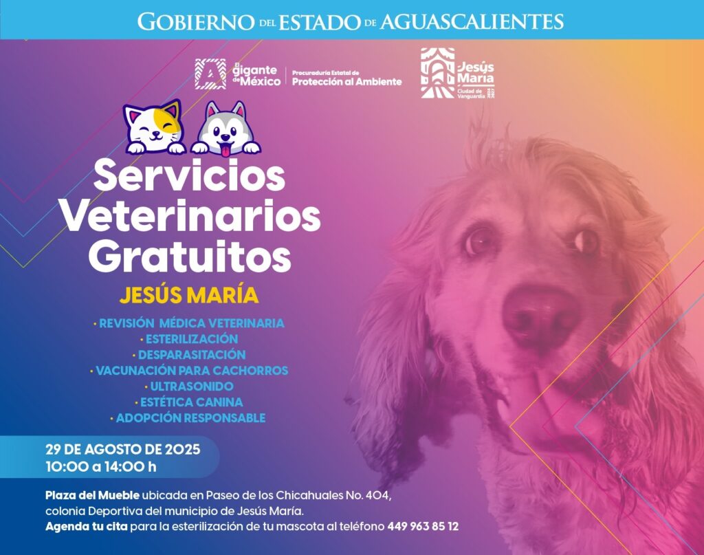En coordinación con el Municipio de Jesús María, este 29 de agosto estaremos con servicios gratuitos para tus mascotas: vacunación, esterilización, consultas, estética, adopciones y más. 🐶🐱💚 ¡Te esperamos!