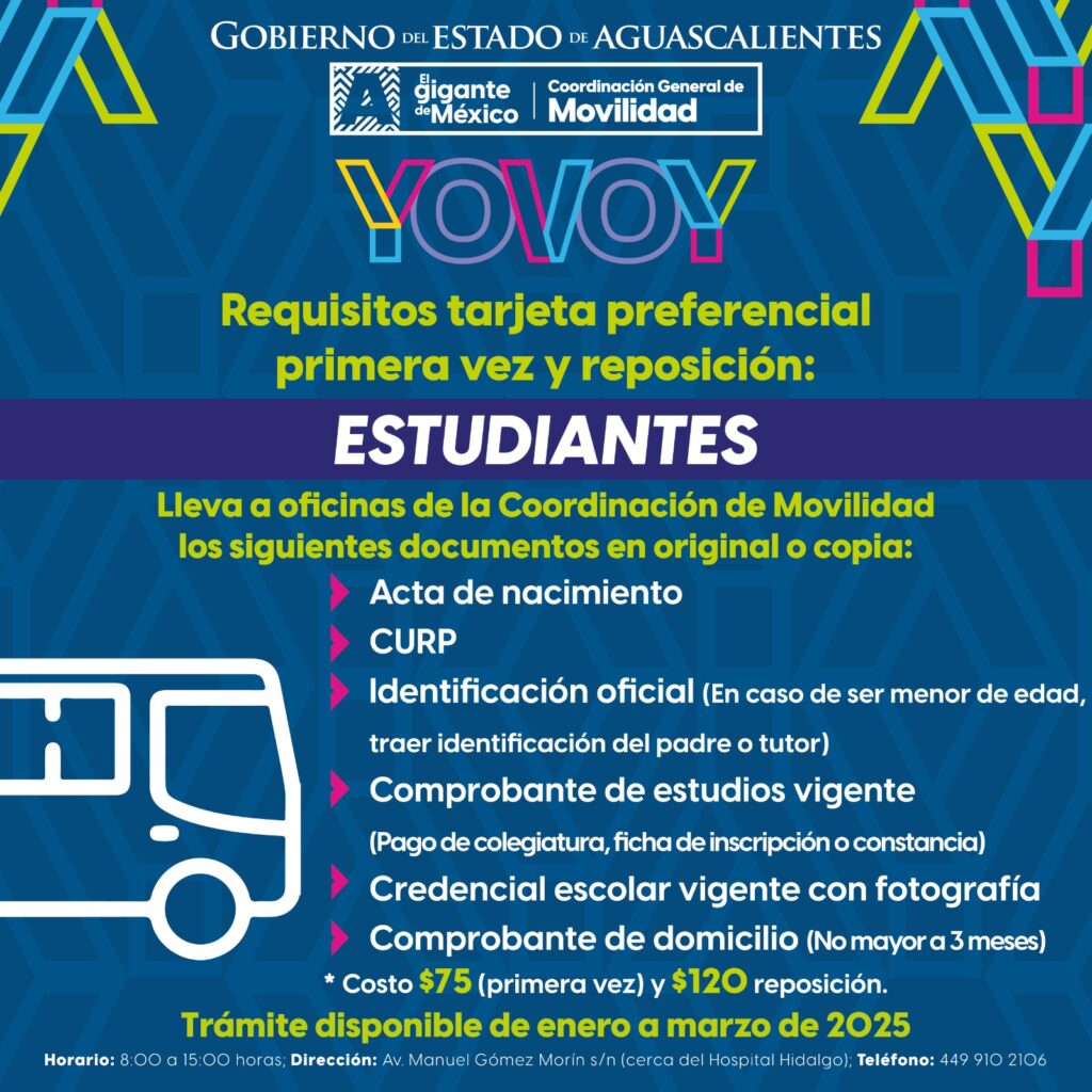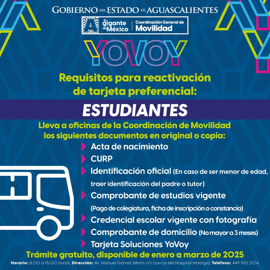 Este 2 de enero, se abrió la convocatoria del Gobierno del Estado de Aguascalientes para que las y los estudiantes tramiten por primera vez o reactiven su Tarjeta Soluciones YoVoy, que les brinda acceso a la tarifa preferencial en los camiones urbanos.
