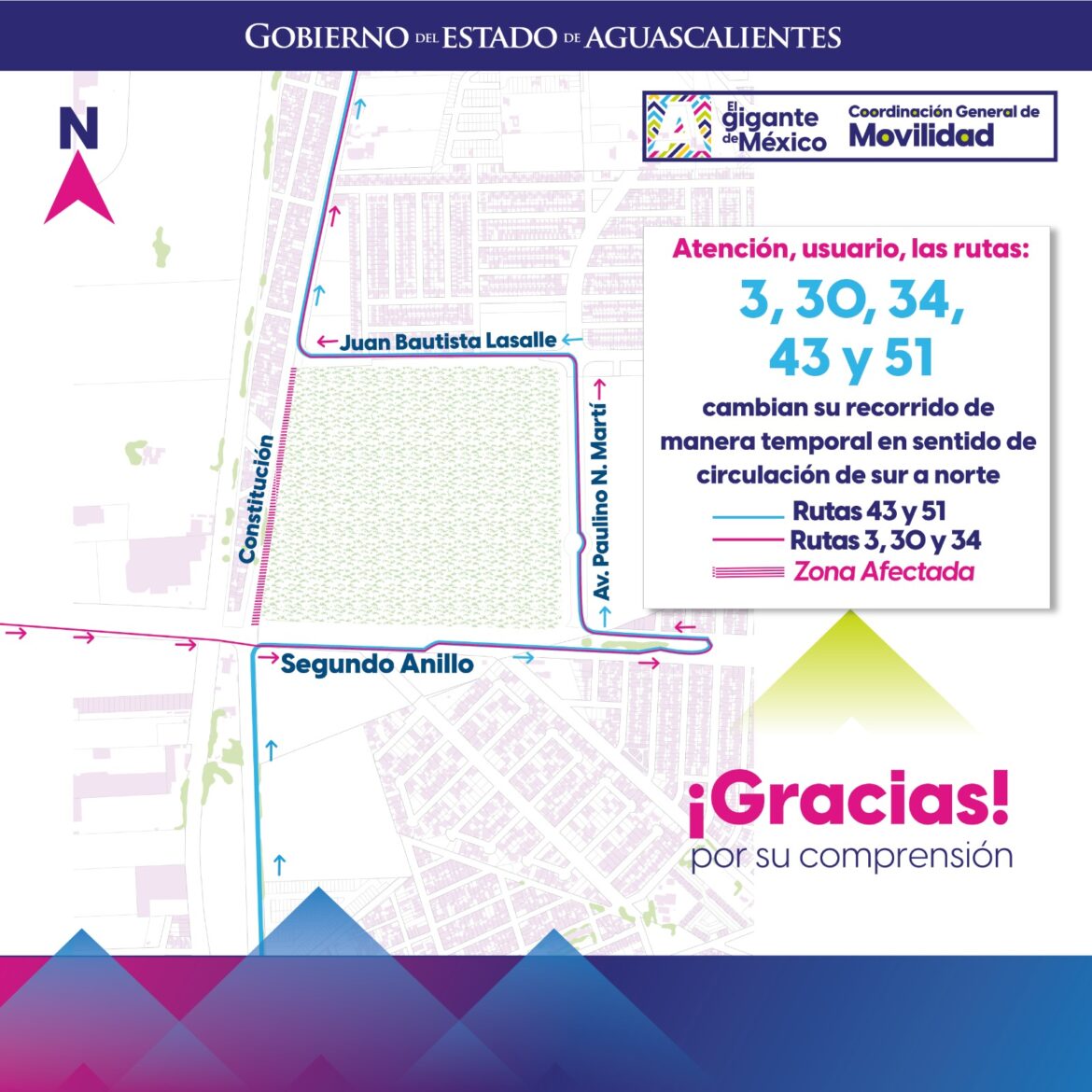 El Gobierno del Estado informa a los usuarios del transporte público que las rutas 3, 30, 34, 43 y 51 cambiaron su recorrido de manera temporal en el sentido de circulación de sur a norte para facilitar los trabajos de reencarpetamiento que se realizan en la Av. Constitución, entre el Segundo Anillo Norte y Juan Bautista Lasalle.