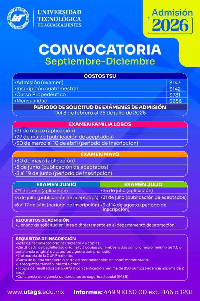 Para mayores informes, las personas interesadas pueden comunicarse a través de las redes sociales oficiales de la UTA https://www.facebook.com/UTAAGS, vía telefónica al 449 910 50 00, extensiones 1146 y 1201; o en el sitio www.utags.edu.mx.