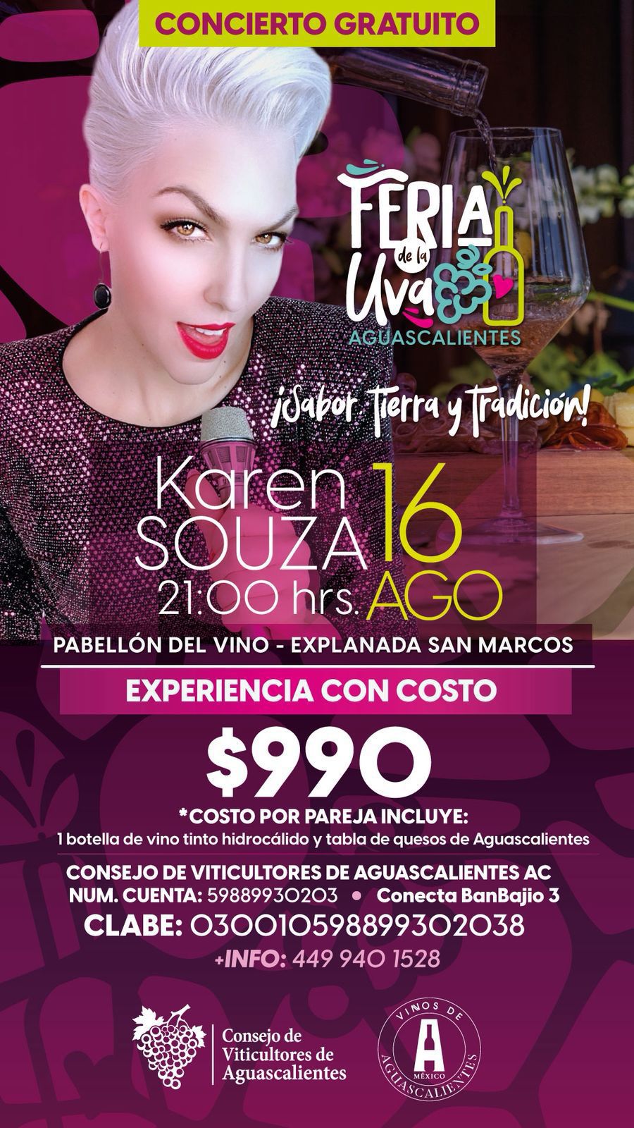 Por solo $990 por pareja, disfruta de una experiencia que incluye: 🍷 1 botella de vino tinto hidrocálido 🧀 Tabla de quesos de Aguascalientes 🎟️ Lugar reservado frente al escenario