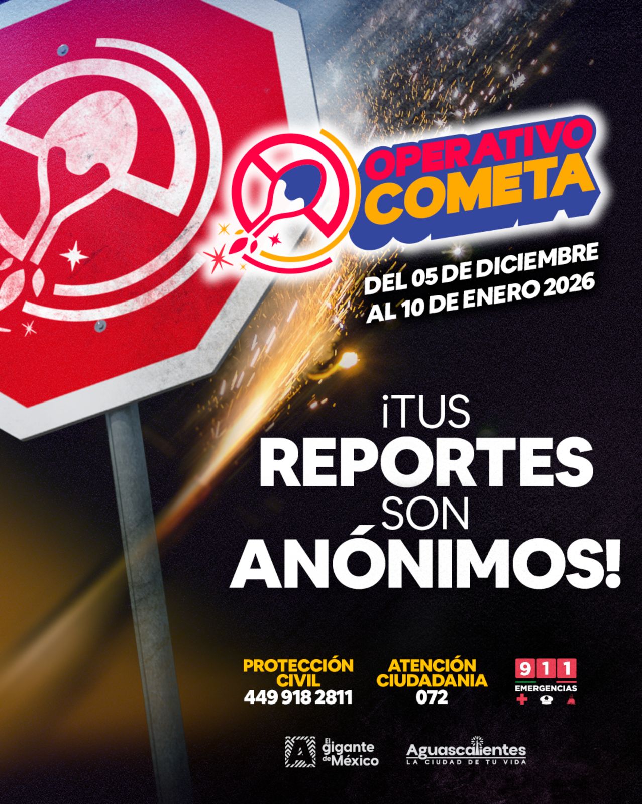 APOYO SOCIALCiudad AGSNAVIDAD 2025PROTECCION CIVILSEGURIDAD Operativo Cometa 🎆🚫La pirotecnia no es un juego. 🚫🔥Evitemos accidentes y cuidemos a nuestros niños, adultos mayores y mascotas. 🐶❤️ by admin 10 de diciembre de 2025 written by admin 10 de diciembre de 2025 0 comments Share 0FacebookTwitterPinterestTumblrVKWhatsappThreadsBlueskyEmail 44 OperativoCometa Aguascalientes CeroPirotecnia el gigante de MéxicoGobierno de Aguascalientes Share 0 FacebookTwitterPinterestTumblrVKWhatsappThreadsBlueskyEmail admin previous post IMPULSA TERE JIMÉNEZ A JÓVENES ESTUDIANTES CON LA ENTREGA DE 1,000 BECAS DE TITULACIÓN next post Felicitamos a Jonathan Muñoz por obtener el tercer lugar en los Campeonatos Centroamericanos y del Caribe de Mayores 2025 que se realizaron en Santo Domingo, República Dominicana, con lo que pone en alto el nombre de nuestro estado y país. You may also like Una noche inolvidable en el Foro del Lago, llena de ritmos vibrantes que... 23 de abril de 2026 CON EL CORAZÓN EN EL AULA, LAS EDUCADORAS SIEMBRAN SUEÑOS PARA TODA LA... 23 de abril de 2026 CON COLOR Y VISIÓN, TERE JIMÉNEZ IMPULSA NUEVA IMAGEN URBANA EN AGUASCALIENTES 23 de abril de 2026 INAUGURA TERE JIMÉNEZ LA EXPO CAMPO Y EL PABELLÓN HECHO EN AGUASCALIENTES EN... 23 de abril de 2026 Martes 21 de abril 23 de abril de 2026 Te compartimos las actividades de la feria nacional de San Marcos para este... 23 de abril de 2026