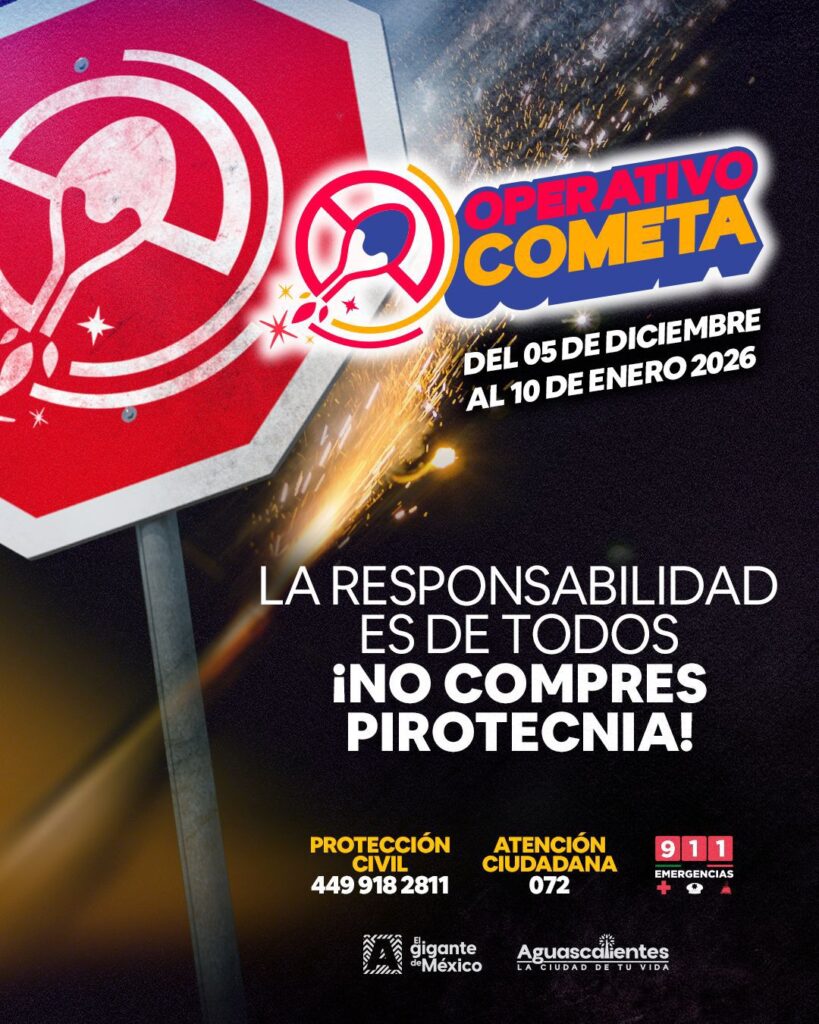 APOYO SOCIALCiudad AGSMEDIO AMBIENTEPROTECCION CIVILSEGURIDAD Operativo Cometa 🎆🚫La pirotecnia no es un juego. 🚫🔥Evitemos accidentes y cuidemos a nuestros niños, adultos mayores y mascotas. 🐶❤️ by admin 16 de diciembre de 2025 written by admin 16 de diciembre de 2025 0 comments Share 0FacebookTwitterPinterestTumblrVKWhatsappThreadsBlueskyEmail 85 OperativoCometa Aguascalientes el gigante de MéxicoGobierno de Aguascalientes Share 0 FacebookTwitterPinterestTumblrVKWhatsappThreadsBlueskyEmail admin previous post ¡Ellos también forman parte de los ganadores de nuestra segunda dinámica! next post AGUASCALIENTES, ENTRE LAS 100 CIUDADES MÁS SEGURAS Y AMIGABLES PARA MOVERSE EN BICICLETA You may also like Una noche inolvidable en el Foro del Lago, llena de ritmos vibrantes que... 23 de abril de 2026 CON EL CORAZÓN EN EL AULA, LAS EDUCADORAS SIEMBRAN SUEÑOS PARA TODA LA... 23 de abril de 2026 CON COLOR Y VISIÓN, TERE JIMÉNEZ IMPULSA NUEVA IMAGEN URBANA EN AGUASCALIENTES 23 de abril de 2026 INAUGURA TERE JIMÉNEZ LA EXPO CAMPO Y EL PABELLÓN HECHO EN AGUASCALIENTES EN... 23 de abril de 2026 Martes 21 de abril 23 de abril de 2026 Te compartimos las actividades de la feria nacional de San Marcos para este... 23 de abril de 2026