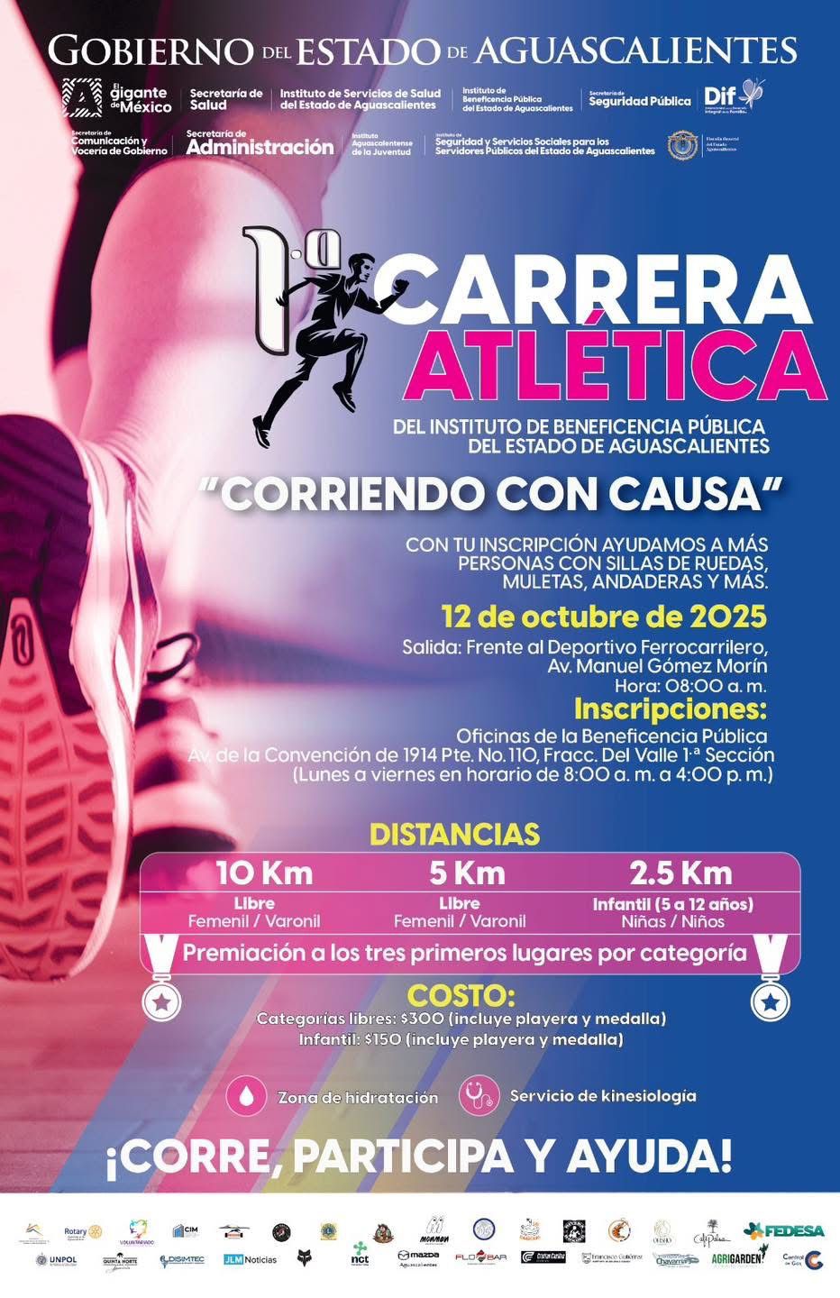 Súmate a la 1.ª Carrera Atlética “Corriendo con Causa” del Instituto de Beneficencia Pública del Estado de Aguascalientes (IBPEA); lo que se recaude por las inscripciones se destinará a la adquisición de sillas de ruedas, muletas, bastones, andaderas y otros apoyos para quienes más lo necesitan.