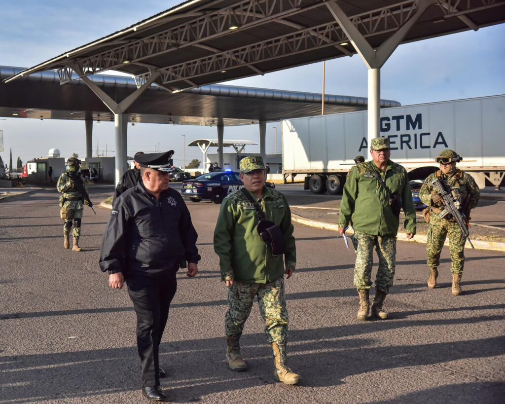 El secretario de Seguridad Pública del Estado, Antonio Martínez Romo, y el general Álvaro Javier Juárez Vázquez, nuevo comandante de la 14/a. Zona Militar, realizaron la mañana de este viernes un recorrido de supervisión en la Puerta de Seguridad Sur, la cual opera las 24 horas del día con presencia permanente de la Policía Estatal, personal del Ejército Mexicano y Guardia Nacional, a fin de llevar a cabo revisiones de vehículos y personas.