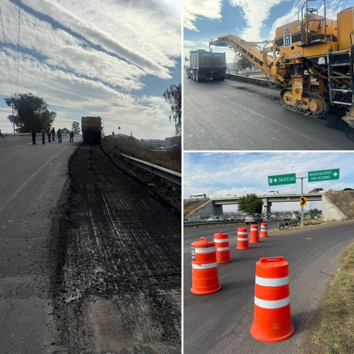 Trabajamos en la repavimentación con asfalto de la carretera que conecta el libramiento a Luis Moya con la carretera 45 Norte, en la circulación de norte a sur, frente al Parque Industrial San Francisco IV. 🚧