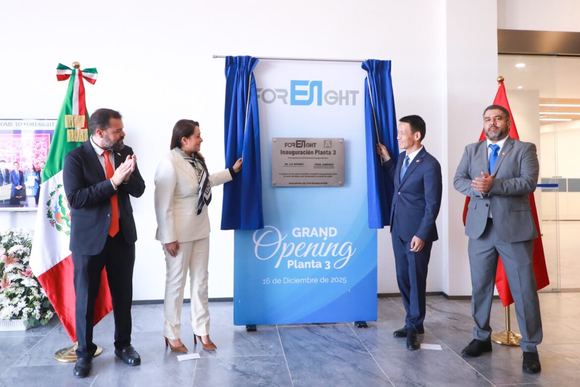 La gobernadora de Aguascalientes, Tere Jiménez, inauguró la tercera planta de la empresa automotriz Foresight, un proyecto que representa una inversión de 899 millones de pesos y la generación de 300 empleos. Esta nueva planta será la más grande y moderna de la compañía a nivel global y estará dedicada a la fabricación de partes plásticas para automóviles y al ensamble de interiores.