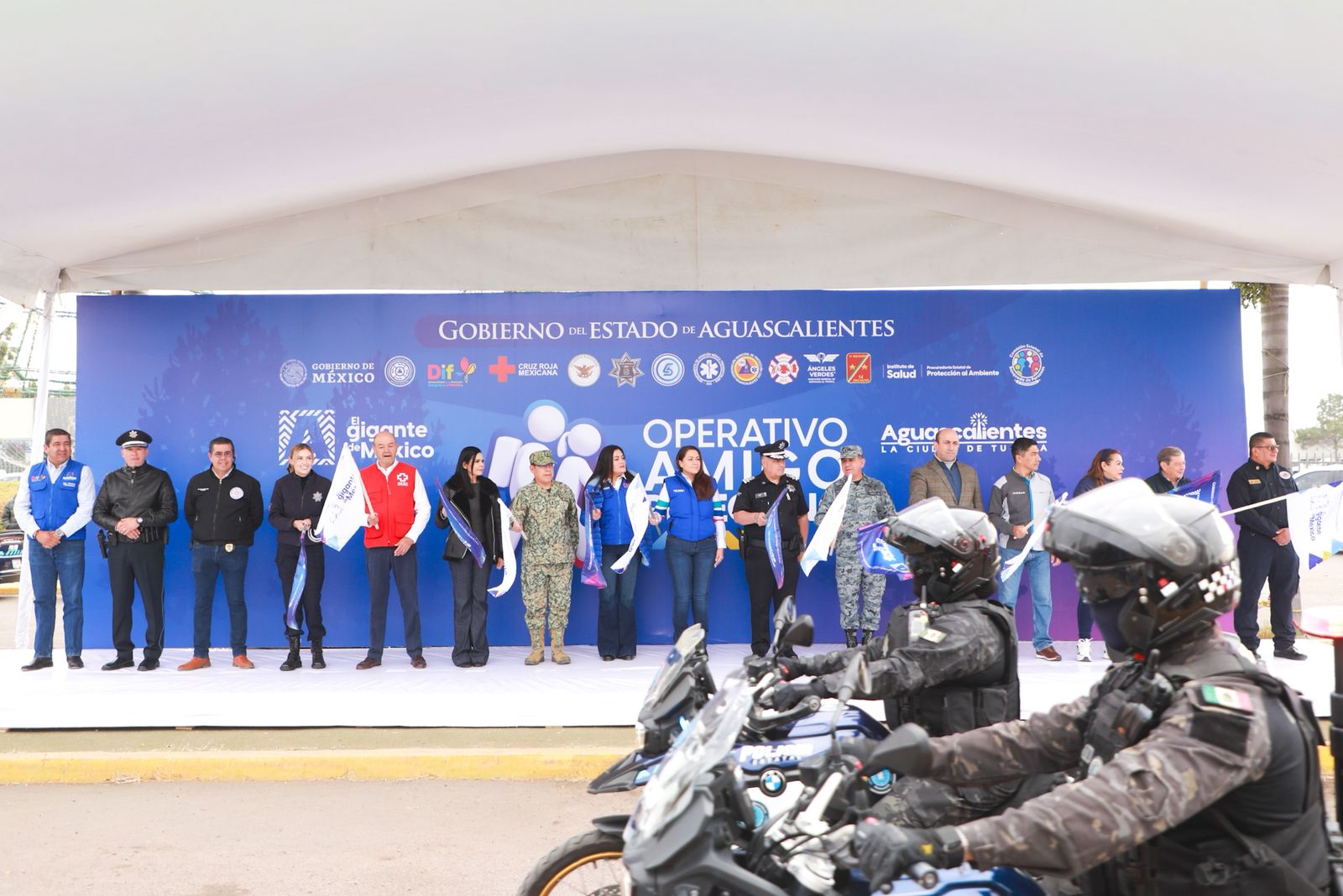 Estuvieron presentes Aurora Jiménez Esquivel, primera voluntaria y presidenta del DIF Estatal; Álvaro Javier Juárez Vázquez, comandante de la 14/a. Zona Militar; Homero Blanco Lozada, coordinador estatal de la Guardia Nacional en Aguascalientes; Nancy Gutiérrez Ruvalcaba, presidenta de la Comisión de Seguridad Pública del H. Congreso del Estado; Julio García, director de Planta Motor NISSAN; Antonio Martínez Romo, secretario de Seguridad Pública del Estado; Rubén Galaviz Tristán, secretario de Salud del Estado; Paty Castillo, secretaria de Desarrollo Social; Manuel Cortina Reynoso, subsecretario de Gobierno; Jesús Eduardo Muñoz de León, coordinador estatal de Protección Civil; Michelle Olmos Álvarez, directora general del C5i; Héctor Castorena Esparza, director del DIF Estatal; Jaime del Conde Ugarte, delegado nacional y consejero nacional de la Cruz Roja Mexicana; Gonzalo Pérez Zúñiga, secretario de Seguridad Pública del Municipio de Aguascalientes; y José Gabino Vázquez Vega, coordinador de Protección Civil municipal.