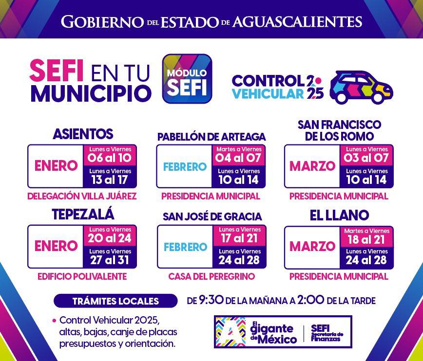 Este módulo visitará el municipio de Asientos del 6 al 10 y del 13 al 17 de enero en la Delegación de Villa Juárez; en Tepezalá del 20 al 24 y del 27 al 31 de enero en el Edificio Polivalente; en Pabellón de Arteaga del 4 al 7 y del 10 al 14 de febrero en la Presidencia Municipal.